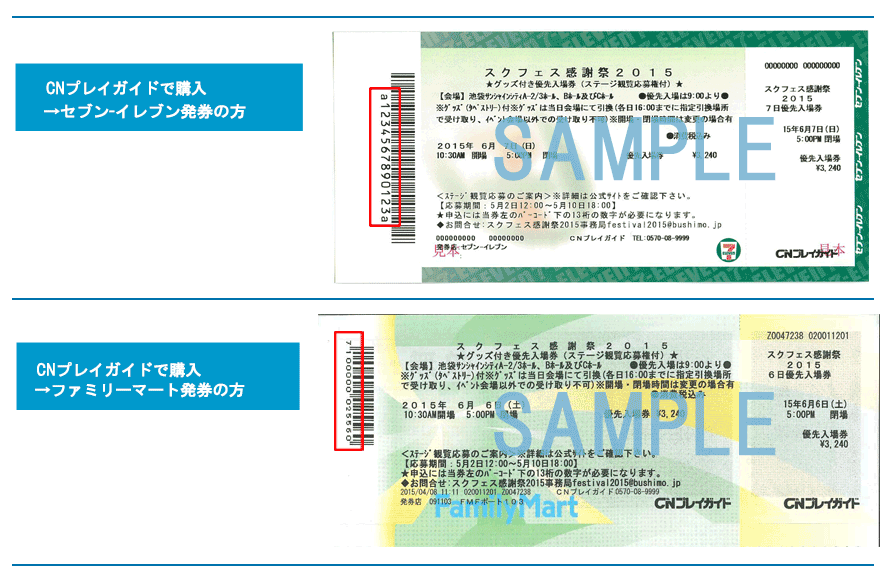 お申込みには<グッズ付き優先入場券(ステージ観覧応募権付))券面へ印字のシリアルコード>が必要となります。 シリアルコードはチケット券面左のバーコード下の13桁の数字となります。 ステージ観覧抽選応募権は、【 5月11日(月) 】お引き取り分まで有効となります。 ステージ観覧抽選応募をされる方は、必ず【 5月11日(月) 】までにチケットをお引き取り下さい。 ![]() 応募できるステージ数は、グッズ付き優先入場券(ステージ観覧応募権付)1枚につき1申込のみ1枚までです。 (入場券1枚につき、同じステージイベントを複数回応募することはできません。) お申込可能ステージは、ご購入のグッズ付き優先入場券(ステージ観覧応募権付)と同日開催のステージのみとなります。 ステージ観覧券発券には、1枚につき別途手数料(店頭発券手数料324円)がかかります。予めご了承ください。 | |